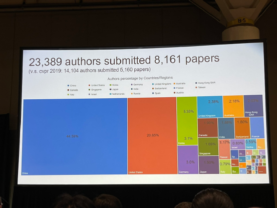 2022 年,CVPR 大会的投稿量达到 8161 份,相比 2021 年度的 7093 份提交增长了 15%。其中 44.59% 的作者来自中国,排在第二名的是美国,占据 20.65%。